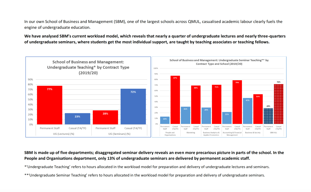 Our analysis of the current workload model the School of Business and Management, one of QMUL’s largest schools, reveals that casualised academic labour clearly fuels the engine of undergraduate education. Nearly a quarter of undergraduate lectures and nearly three-quarters of undergraduate seminars, where students get the most individuals support, are taught by teaching associates or teaching fellows. See attached PDF fuller analysis.