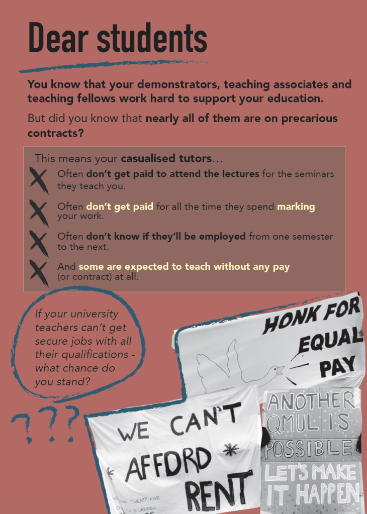 Having braved the rain to declare opposition to institutional racism yesterday, today QMUCU members initially focused their attention on the campaign against casualisation, highlighting the key issues in flyers addressed to students: