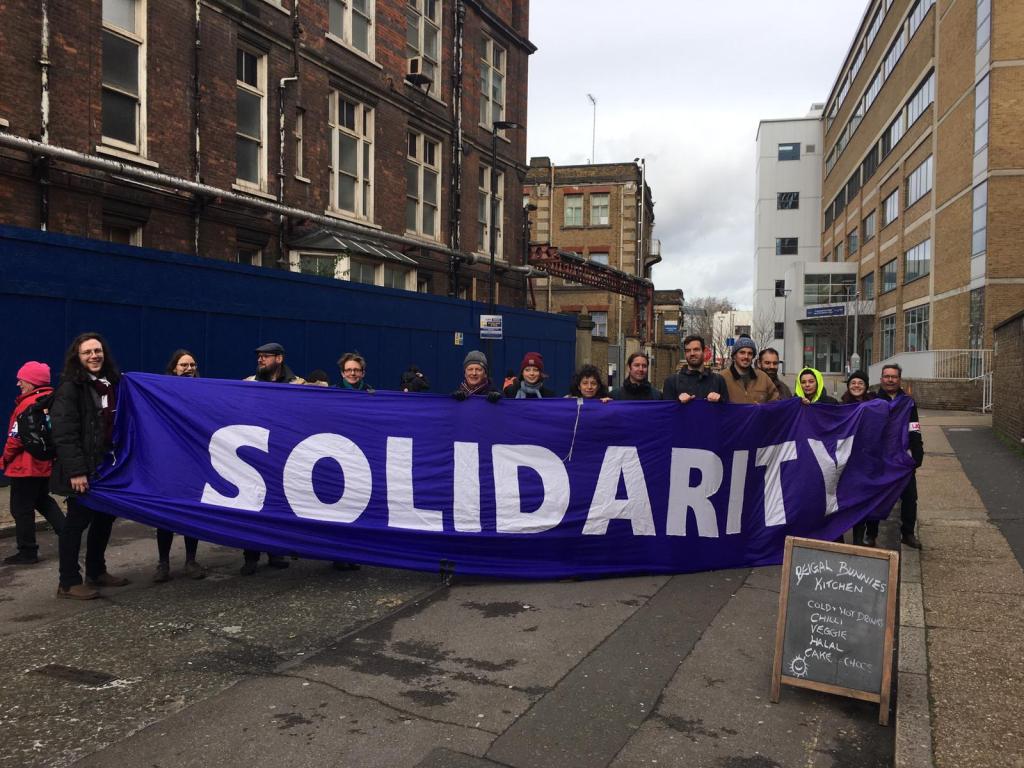 Late in the morning Mile End picketers walked down to visit our comrades on the Whitechapel pickets, flying the branch’s purple solidarity banner outside the Garrod Building.
