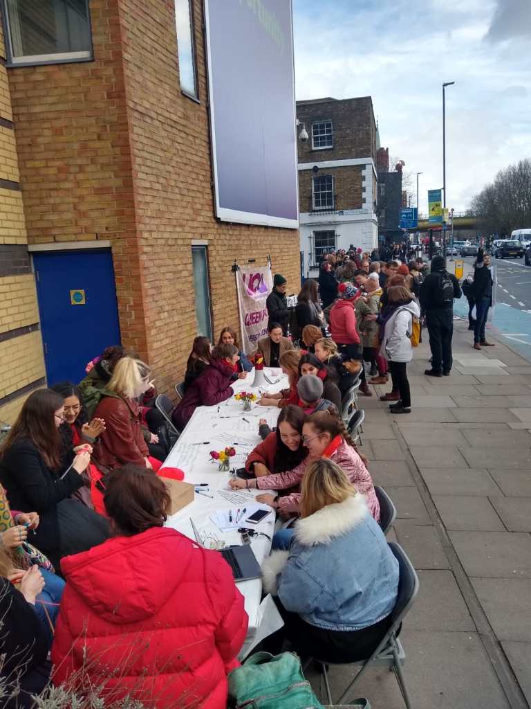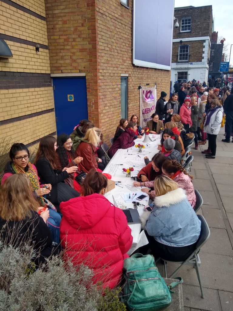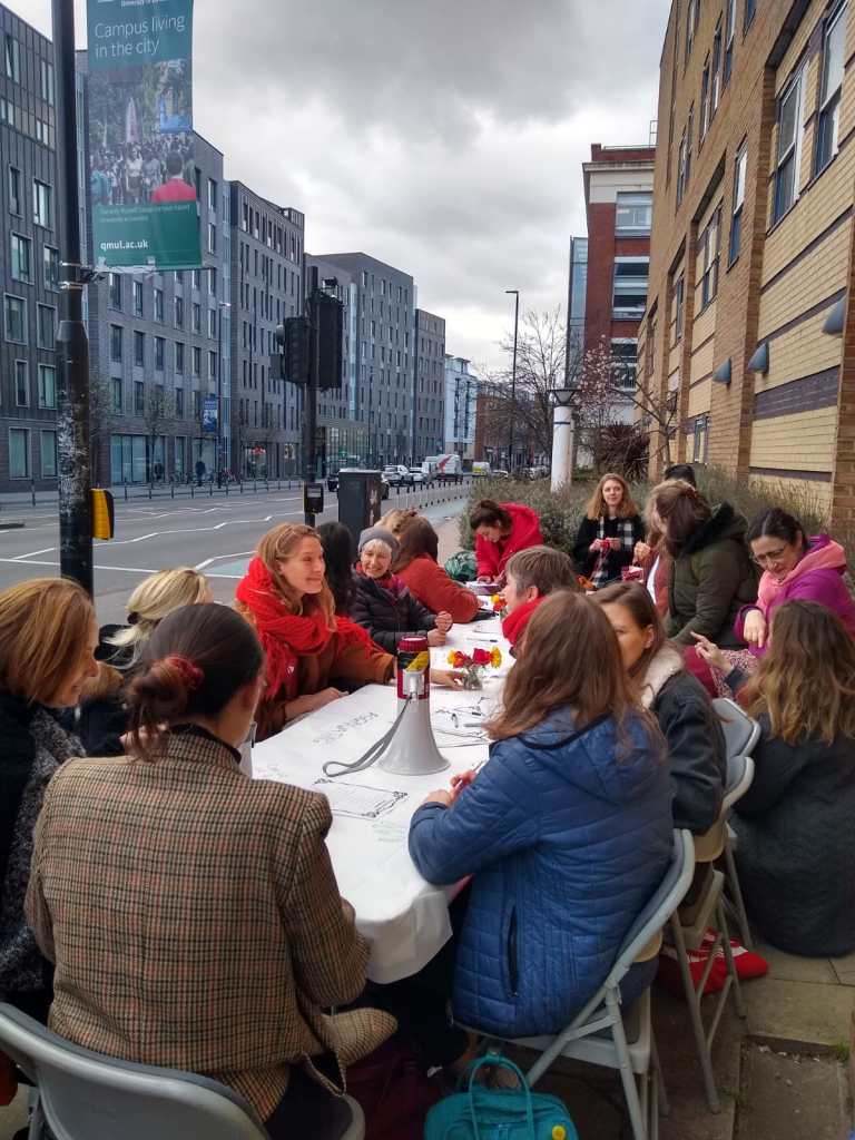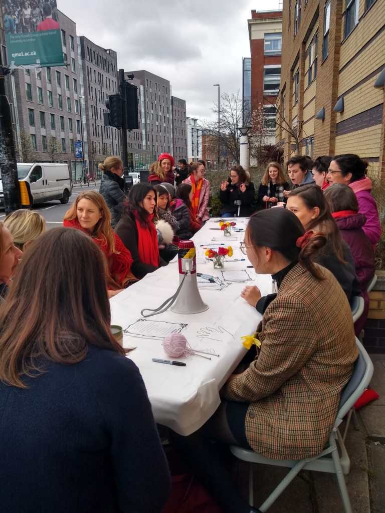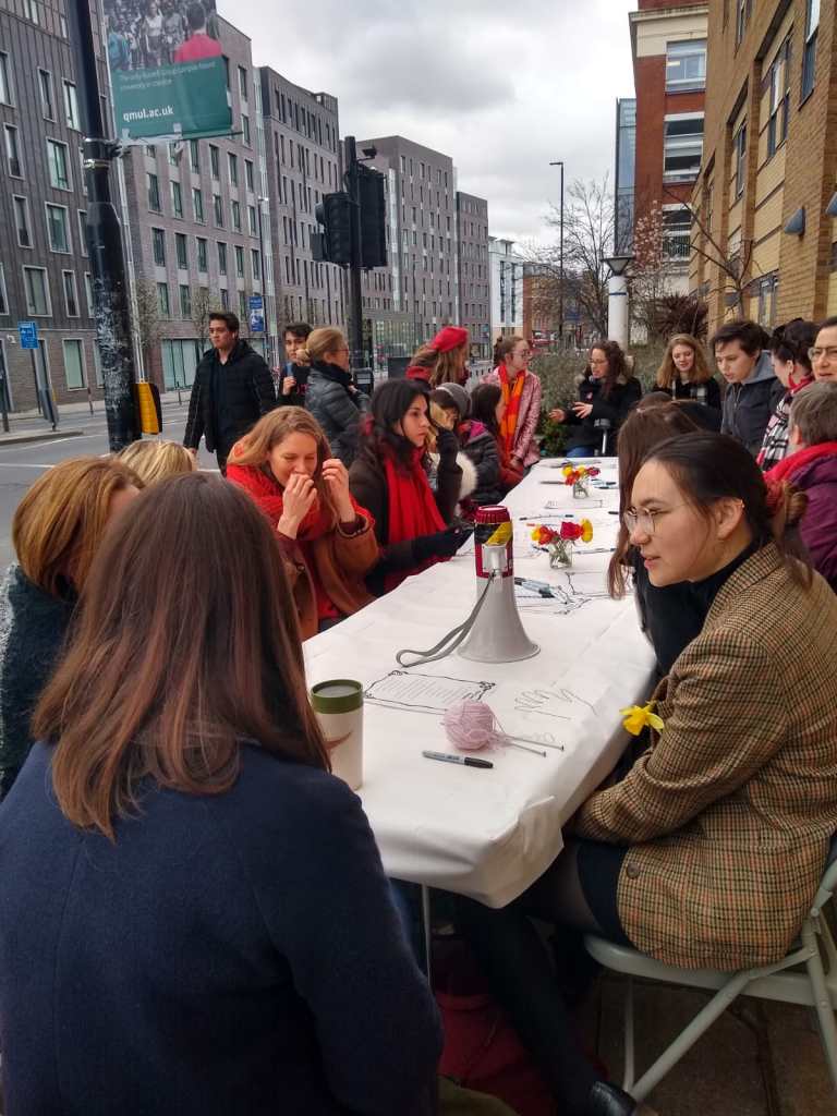 East Gate was the site of much of today’s activity, including a Long Table on the Rights of all Women, Transgender, Non-Binary, Intersex and Gender Diverse Colleagues and Students at QMUL! Reproducing the internationally toured work of Lois Weaver (School of English & Drama), QMUCU picketers and visitors engaged in an open-ended, non-hierarchical discussion that rightfully pushed the issue of gender inequalities at QM to the forefront of today’s strike action.