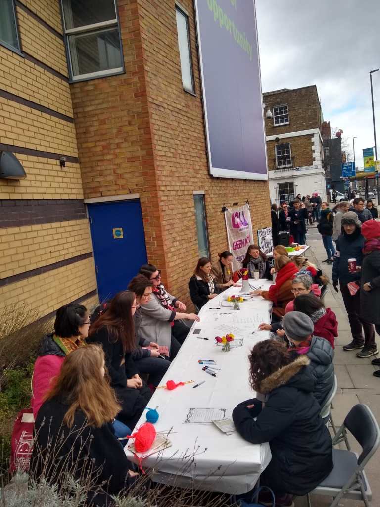 Alongside the Long Table, there have been three more fantastic teach-outs today. This morning there was a welcome return for the “Knit Out”, encouraging picketers and visitors to rethink the relationship between leisure and work with knitting needles in hand! There were also workshops held by visiting members of the Labour Party’s Community Organising Unit and by the Climate Action Group.