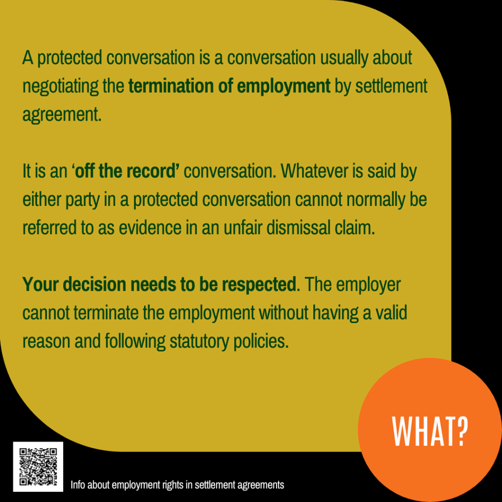The legal terms of protected conversations, also known as ‘pre-termination settlement negotiations’, are set out in section 111A of the Employment Rights Act 1996. Further information about how to understand these terms can be found in this ACAS guide on settlement agreements.