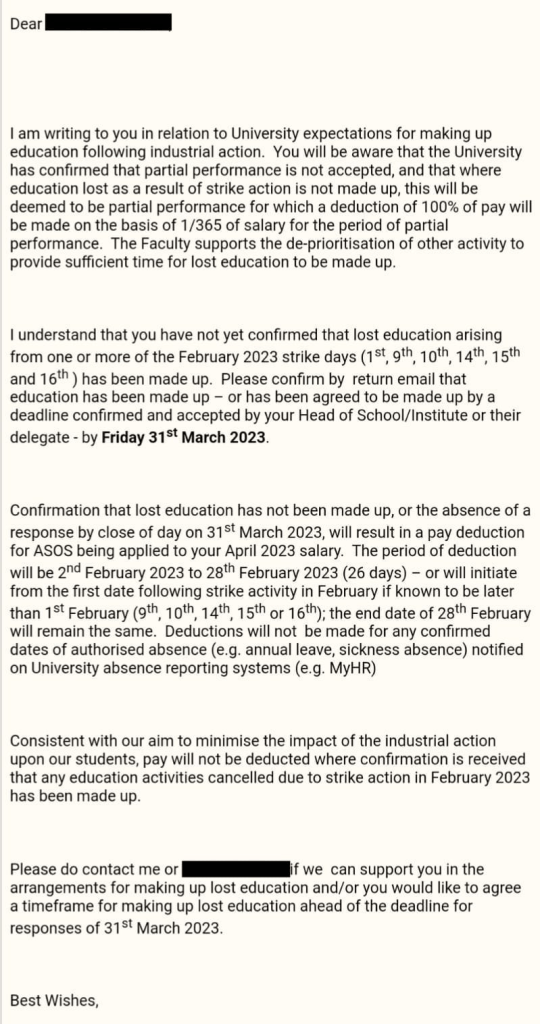 Senior management at QMUL is deducting 113 days of wages from staff for the crime of trying to get the university sector to acknowledge that the current working conditions and pay are not sustainable. They are now also demanding the return of marks at an impossible speed. Marks which staff hasn’t been paid for, we need to stress.